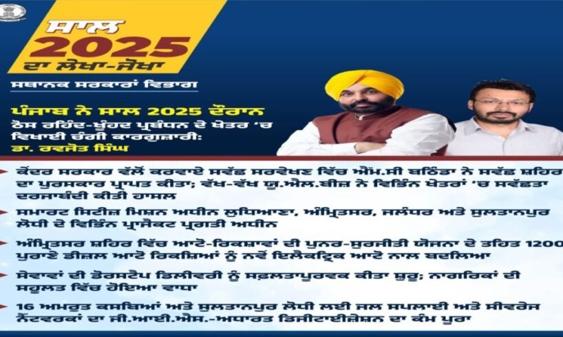 पंजाब ने वर्ष 2025 के दौरान ठोस अपशिष्ट प्रबंधन के क्षेत्र में सराहनीय प्रदर्शन किया है। भारत सरकार के आवास एवं शहरी कार्य मंत्रालय द्वारा कराए गए स्वच्छ सर्वेक्षण में नगर निगम बठिंडा ने स्वच्छ शहर का पुरस्कार प्राप्त किया है। इसी प्रकार 25 यू.एल.बीज़ को कूड़ा मुक्त स्टार-1, 01 यू.एल.बी को कूड़ा मुक्त स्टार-3, 46 यू.एल.बीज़ को वाटर+ के रूप में, 53 यू.एल.बीज़ को ओडीएफ++ के रूप में, 43 यू.एल.बीज़ को ओडीएफ+ के रूप में तथा 22 यू.एल.बीज़ को ओडीएफ के रूप में प्रमाणित किया गया है।